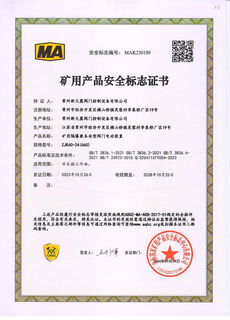 礦用產(chǎn)品安全標志證書ZJK60-24(660)