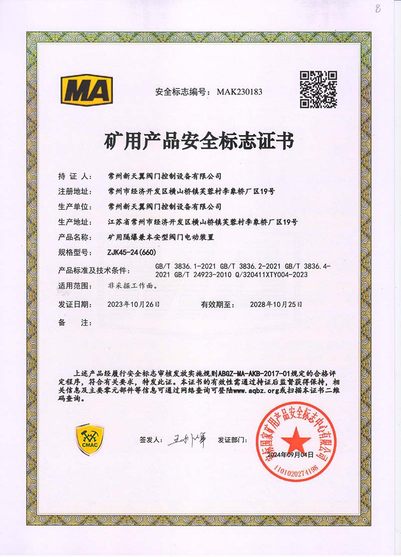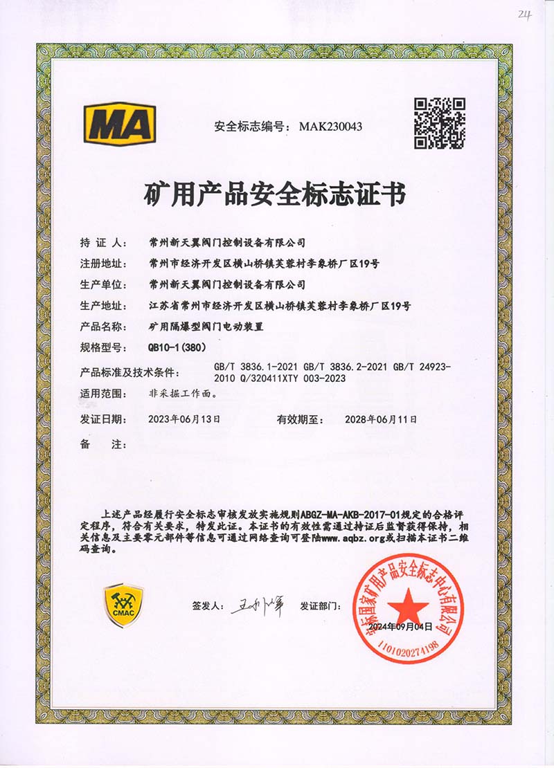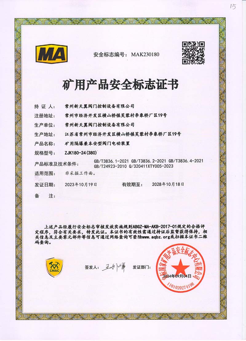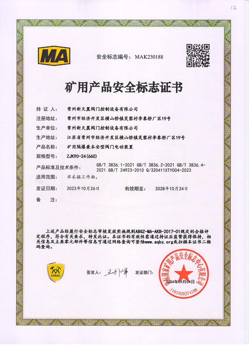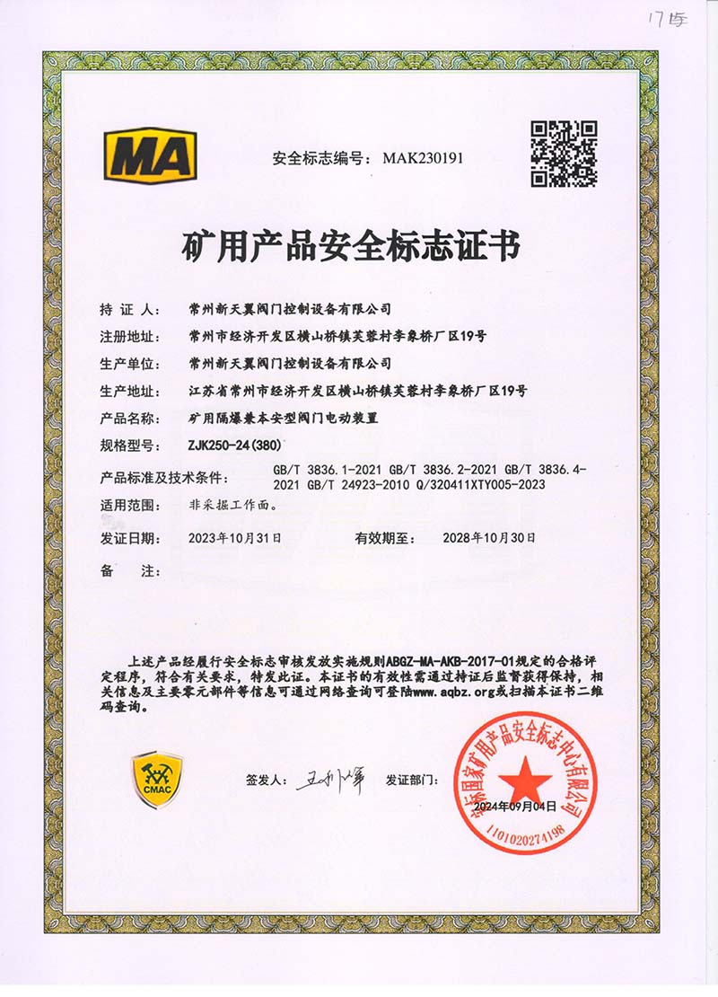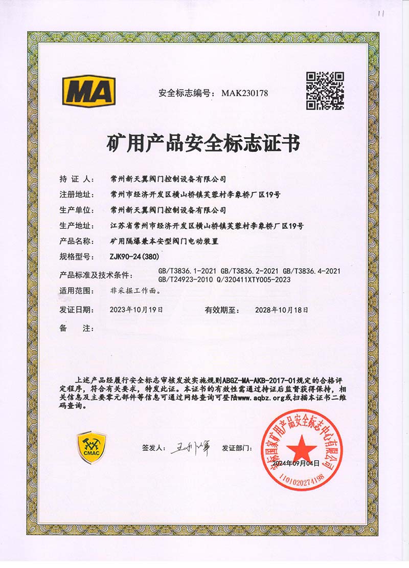 礦用產(chǎn)品安全標志證書ZJK180-24(380)