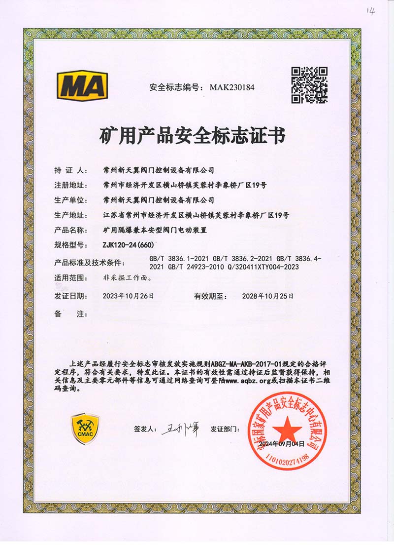 礦用產(chǎn)品安全標志證書ZJK120-24(660)