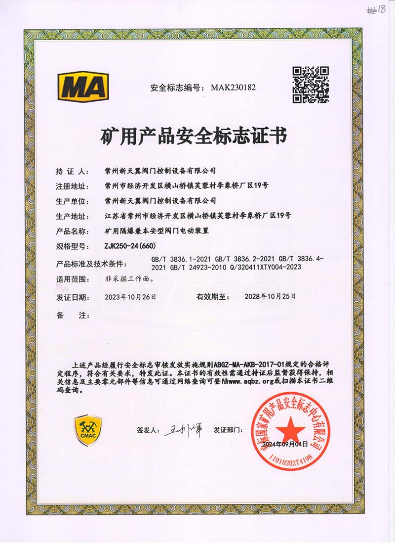 礦用產(chǎn)品安全標志證書ZJK180-24(660)