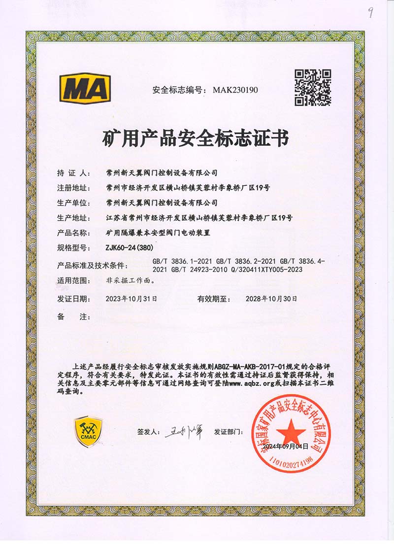 礦用產(chǎn)品安全標志證書ZJK60-24(380)