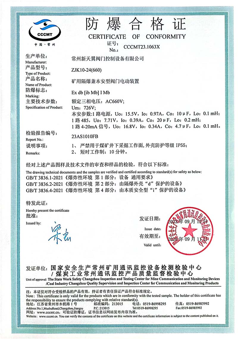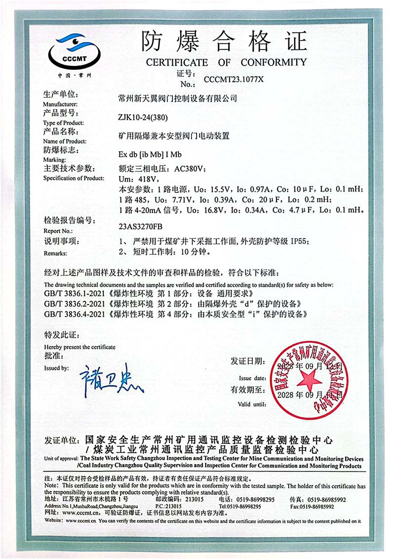 礦用產(chǎn)品安全標志證書ZJK20-24(380)