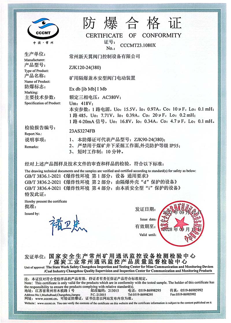 礦用產(chǎn)品安全標志證書ZJK120-24(380)