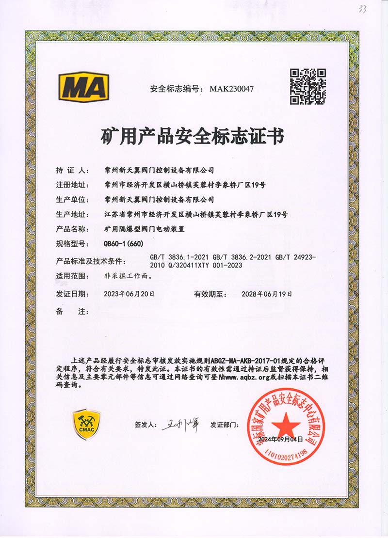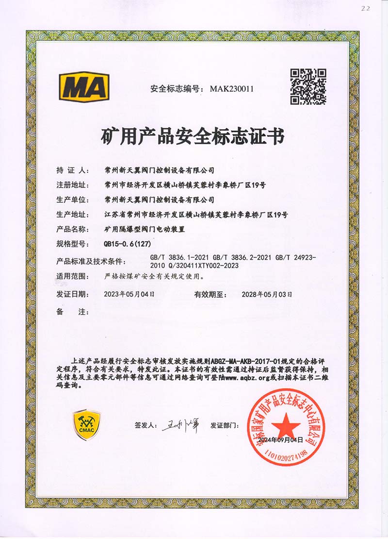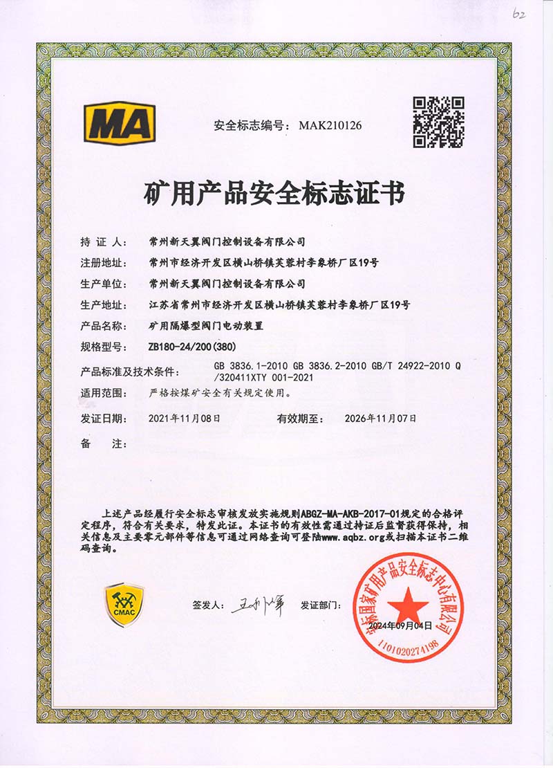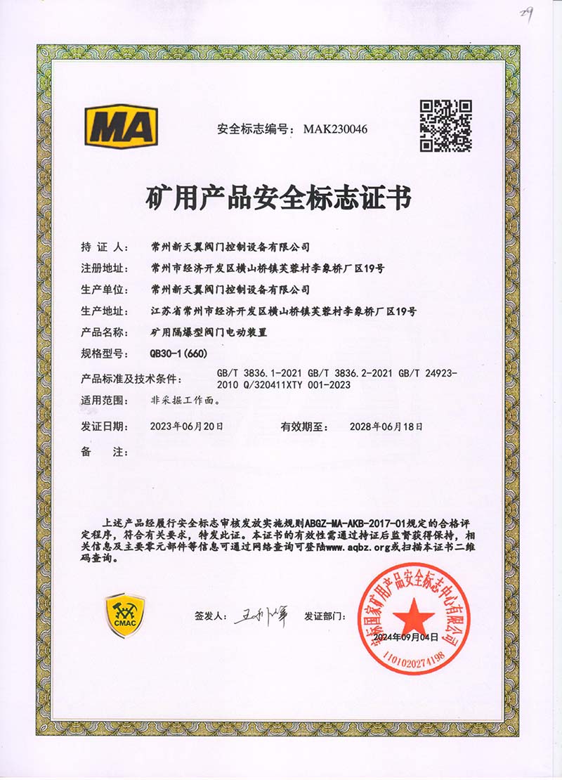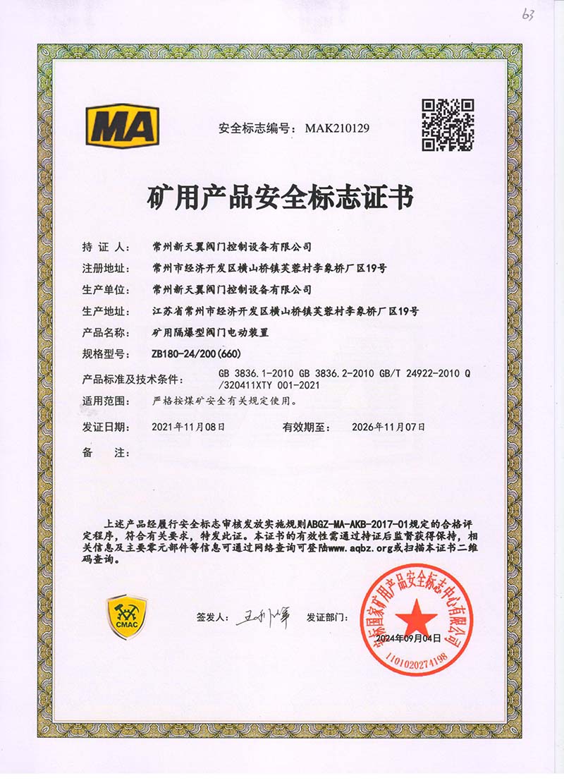 礦用產(chǎn)品安全標志證書ZB30-24 200(660)