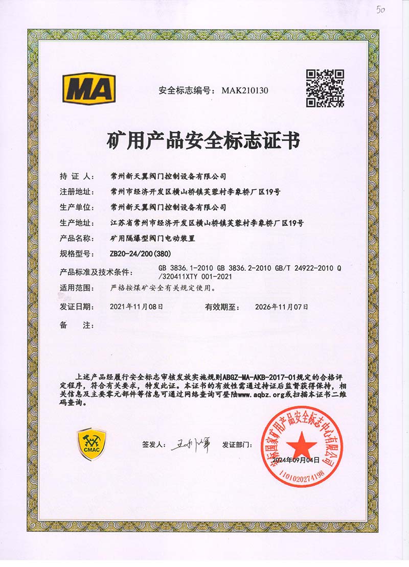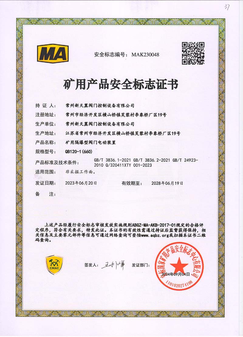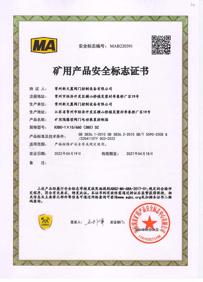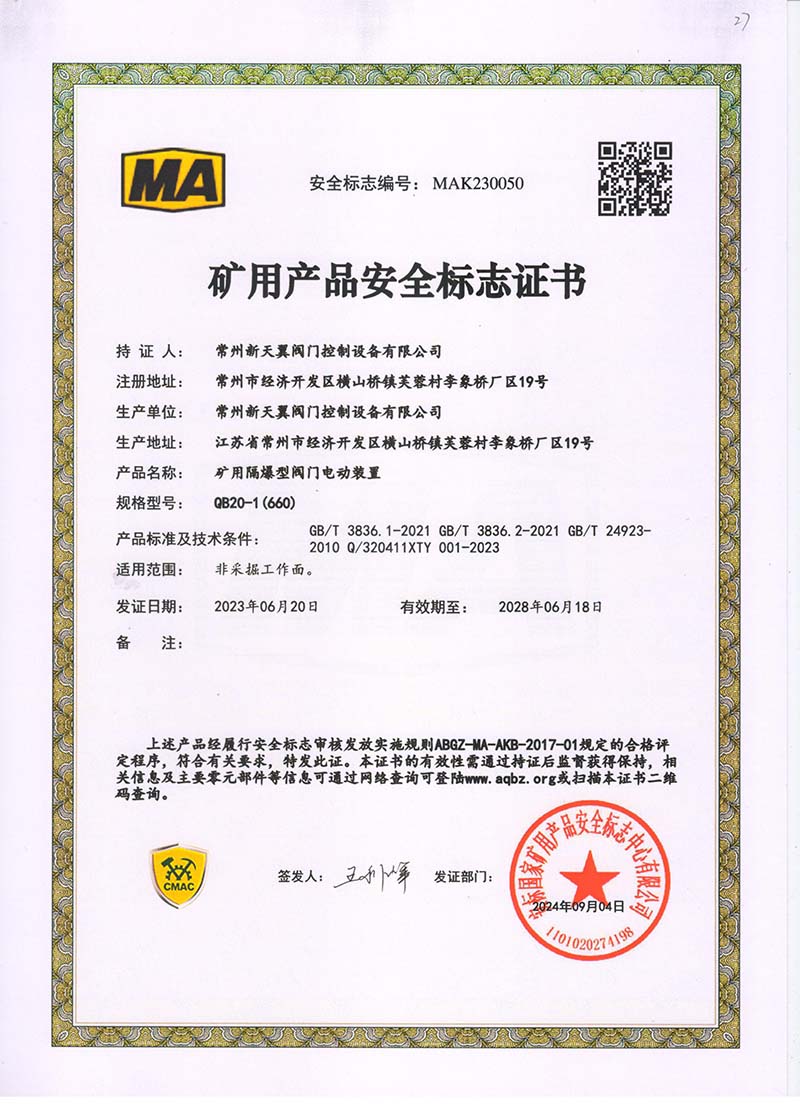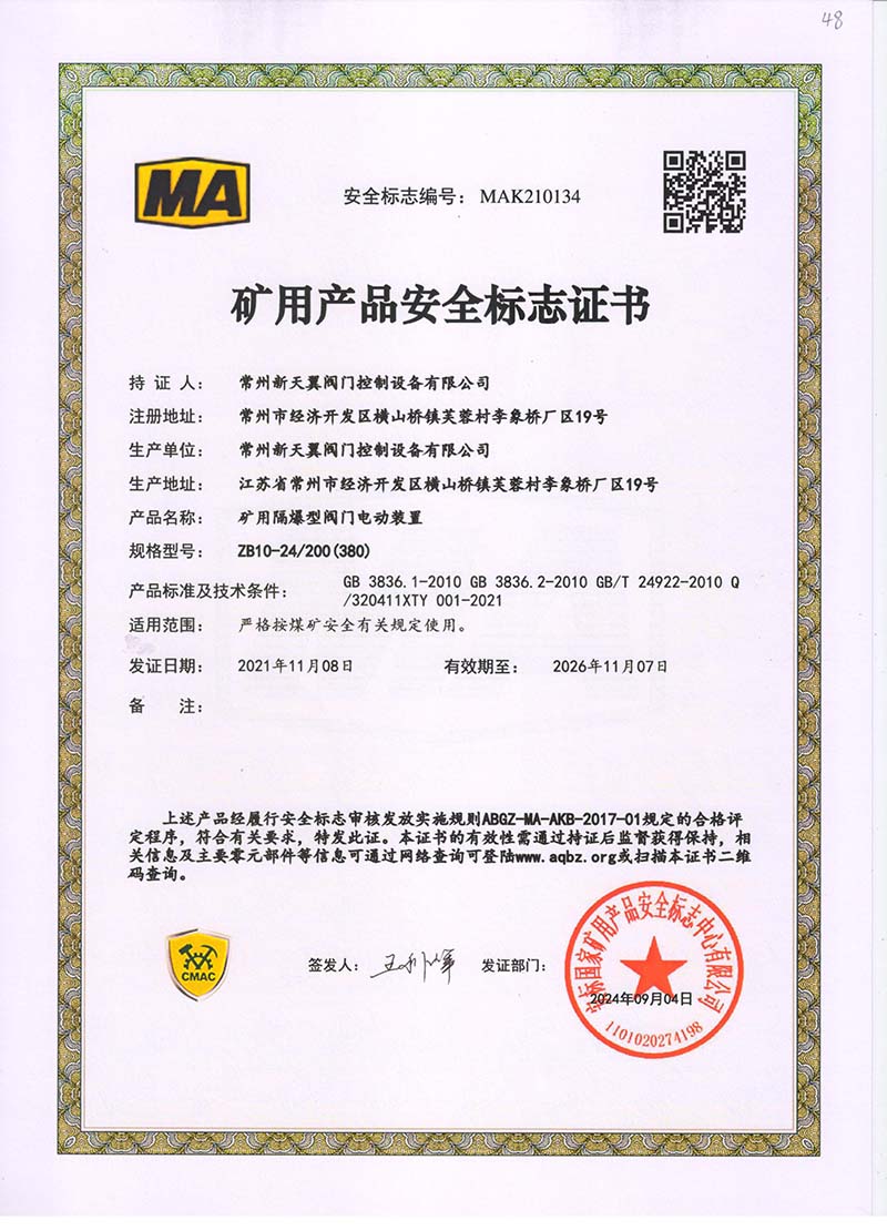 礦用產(chǎn)品安全標志證書ZB30-24 200(660)