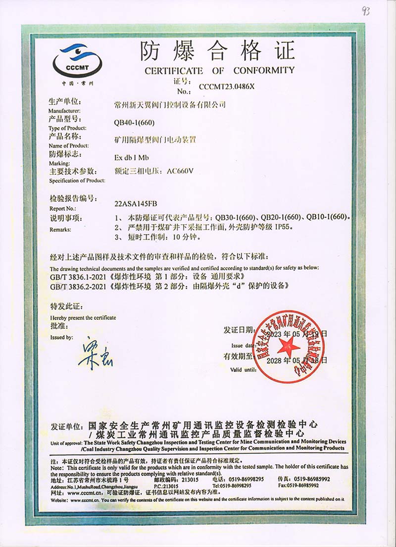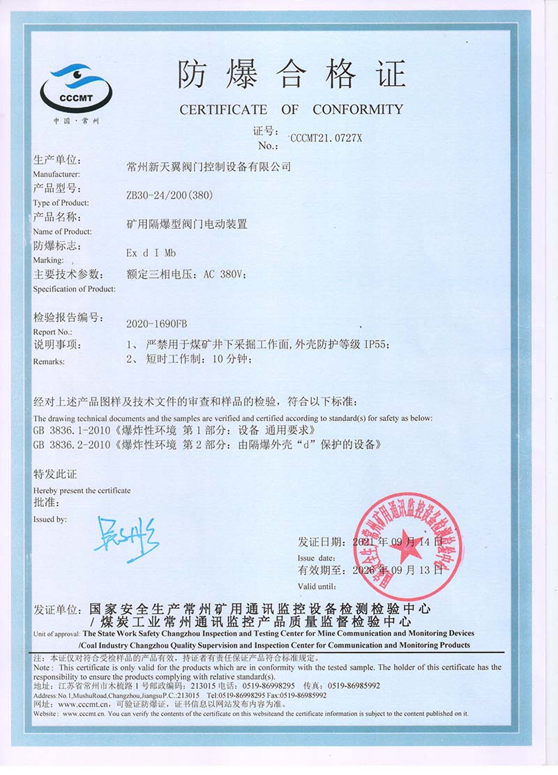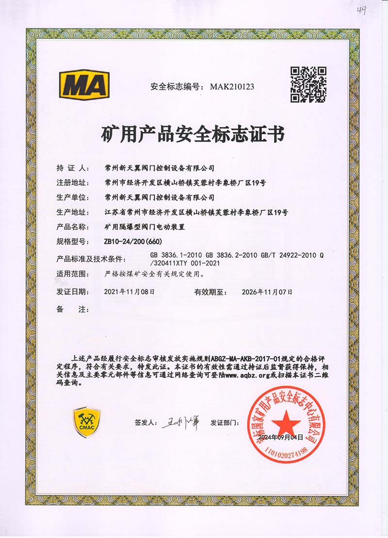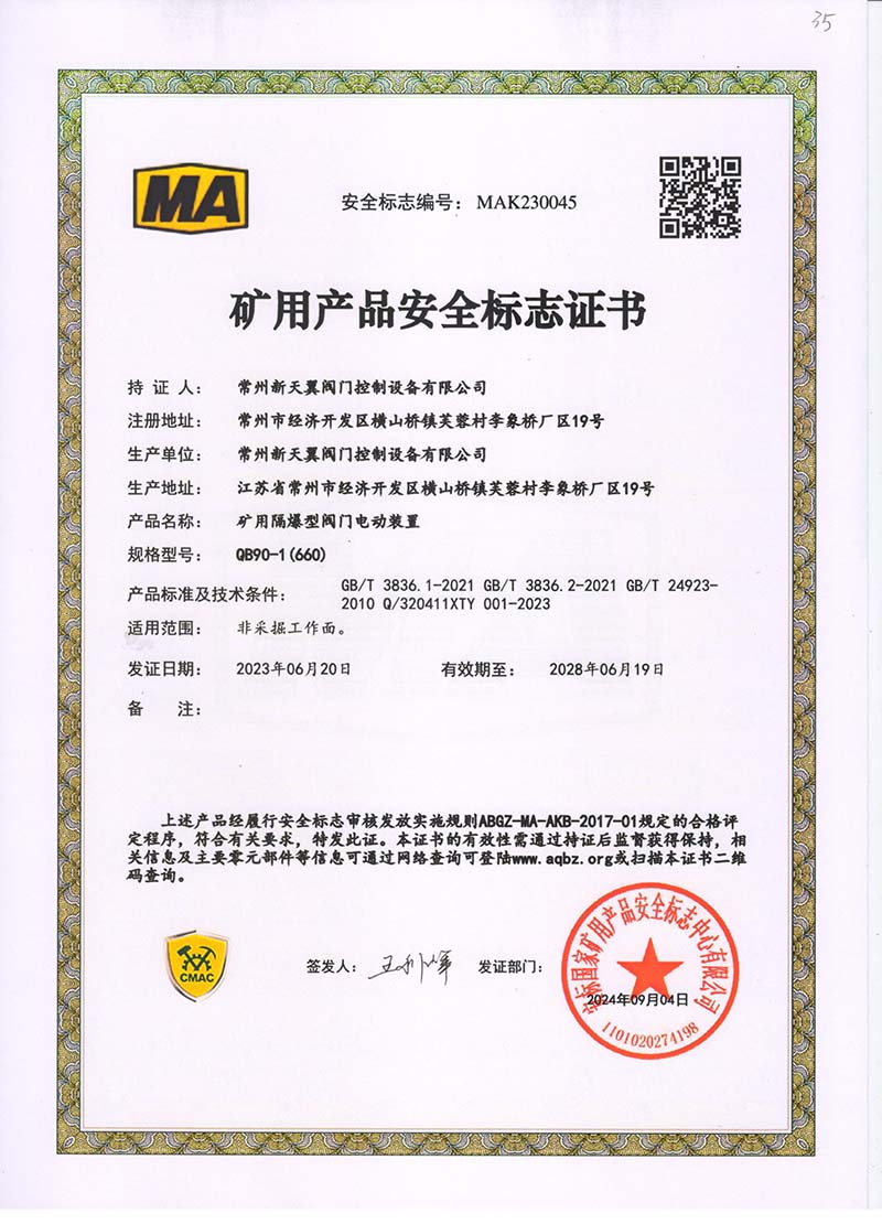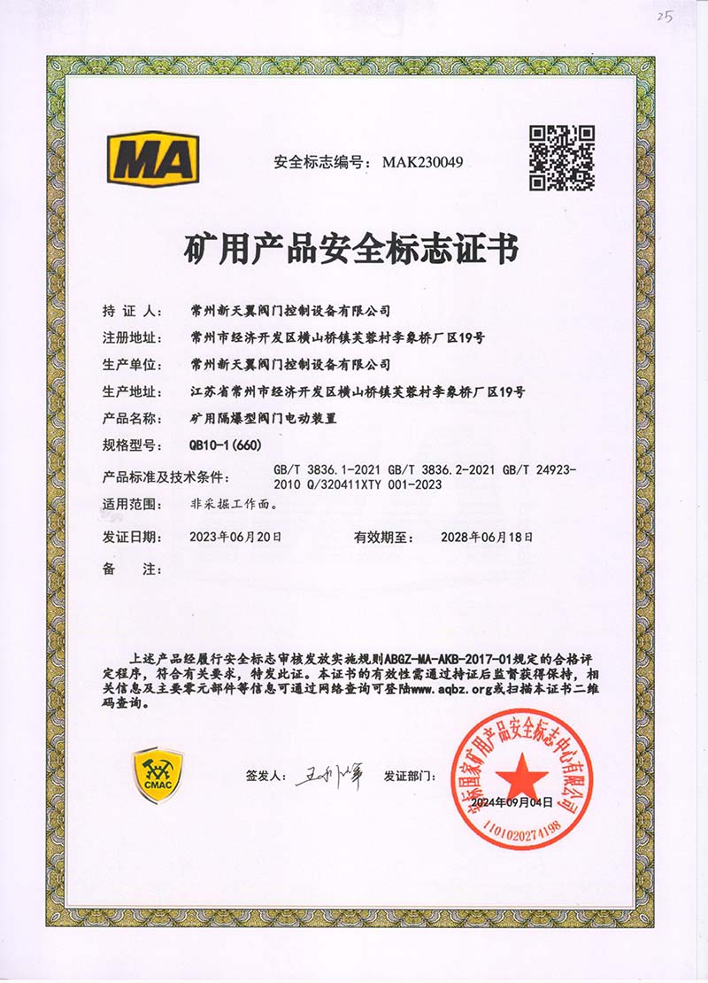 礦用產(chǎn)品安全標志證書ZB30-24 200(660)