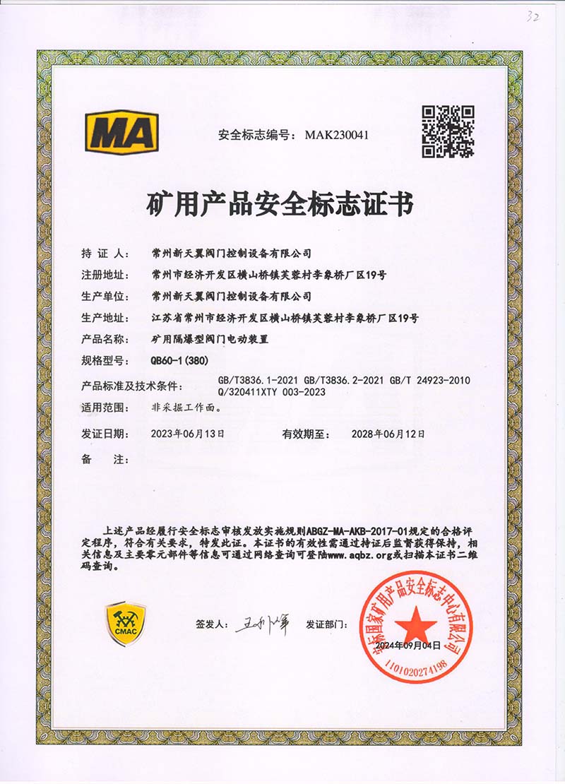 礦用產(chǎn)品安全標志證書QB60-1(380)