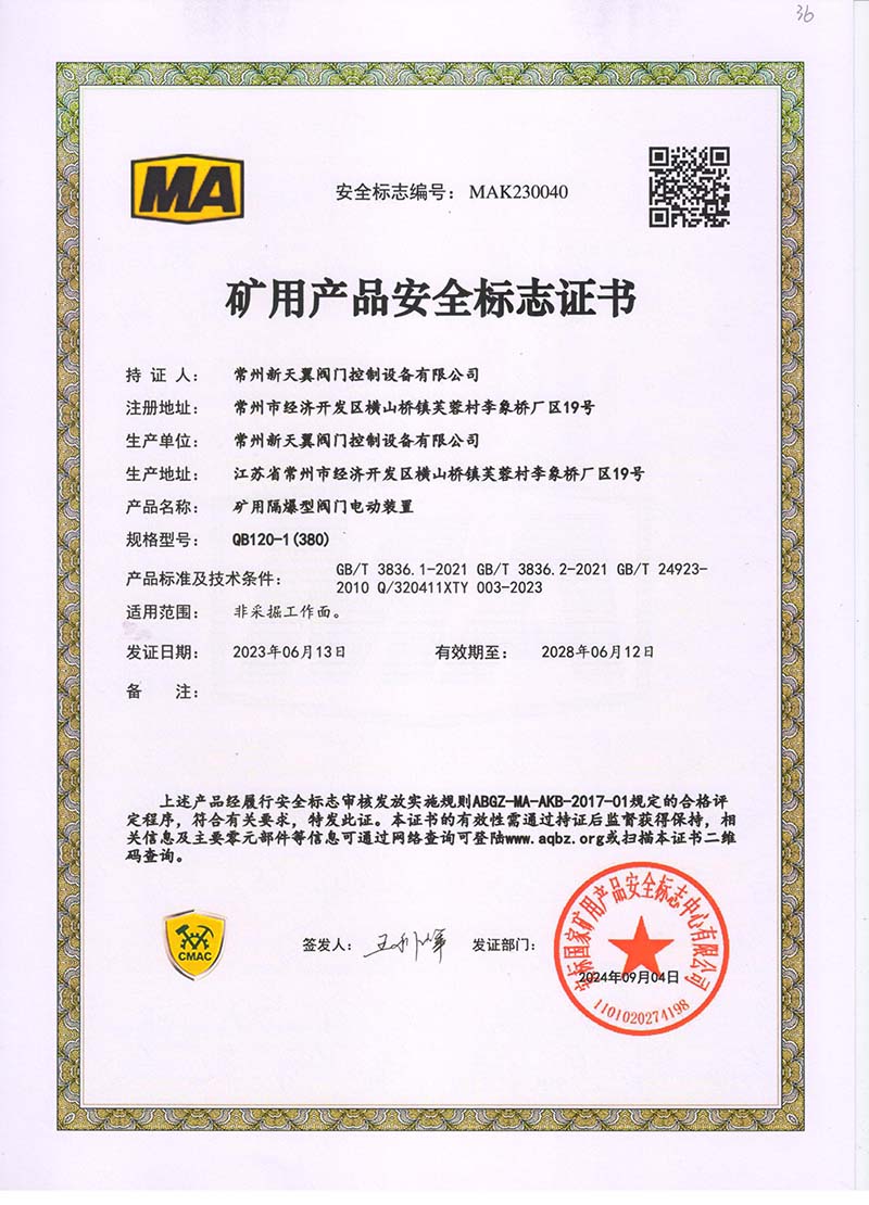 礦用產(chǎn)品安全標志證書QB120-1(380)
