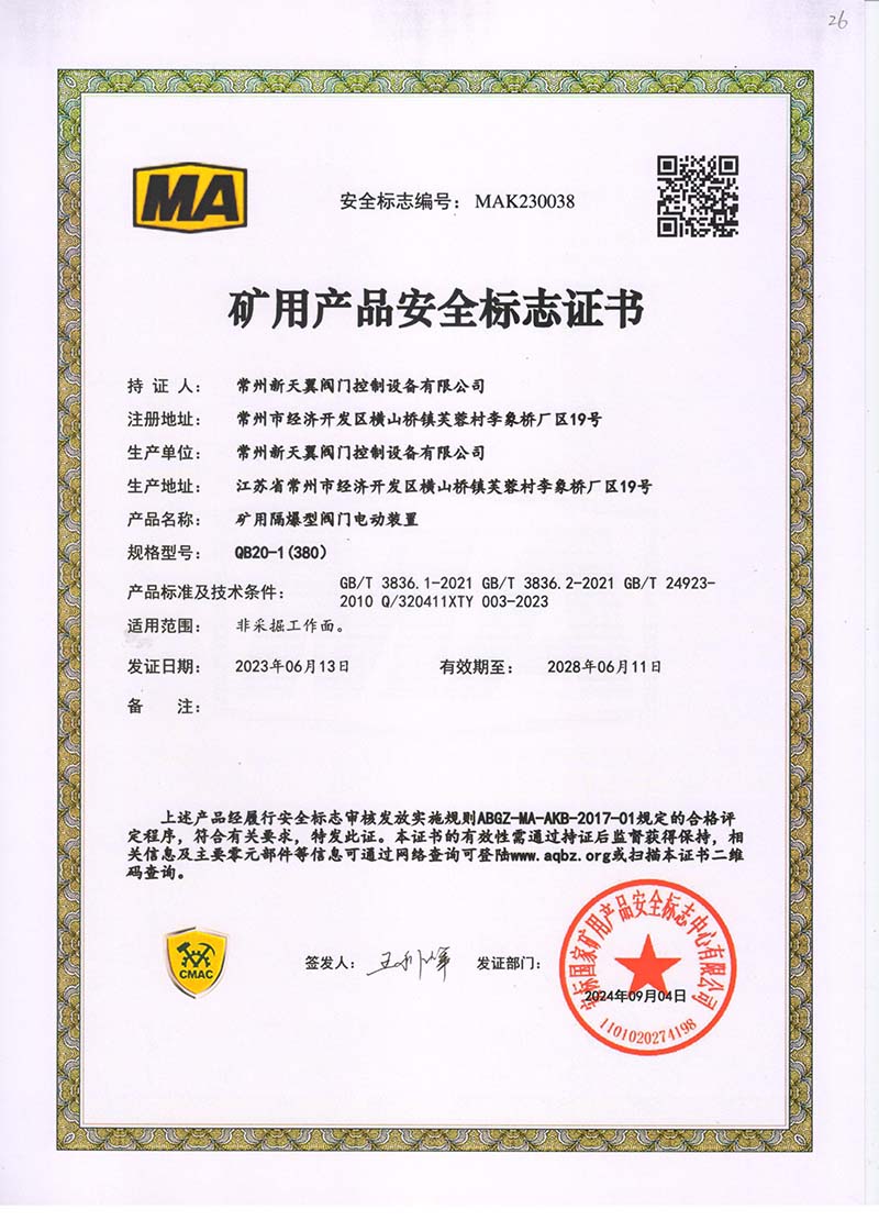 礦用產(chǎn)品安全標志證書QB20-1(380)