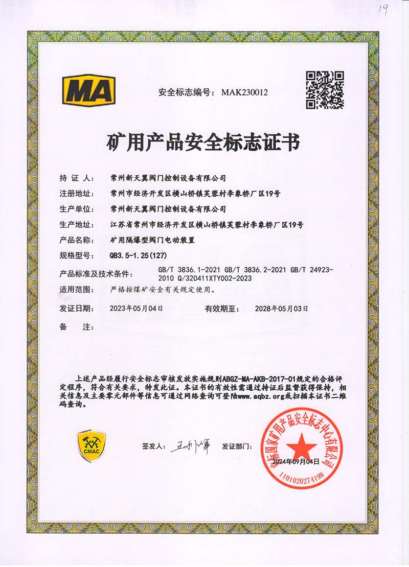 礦用產(chǎn)品安全標志證書QB5-1.25(127)