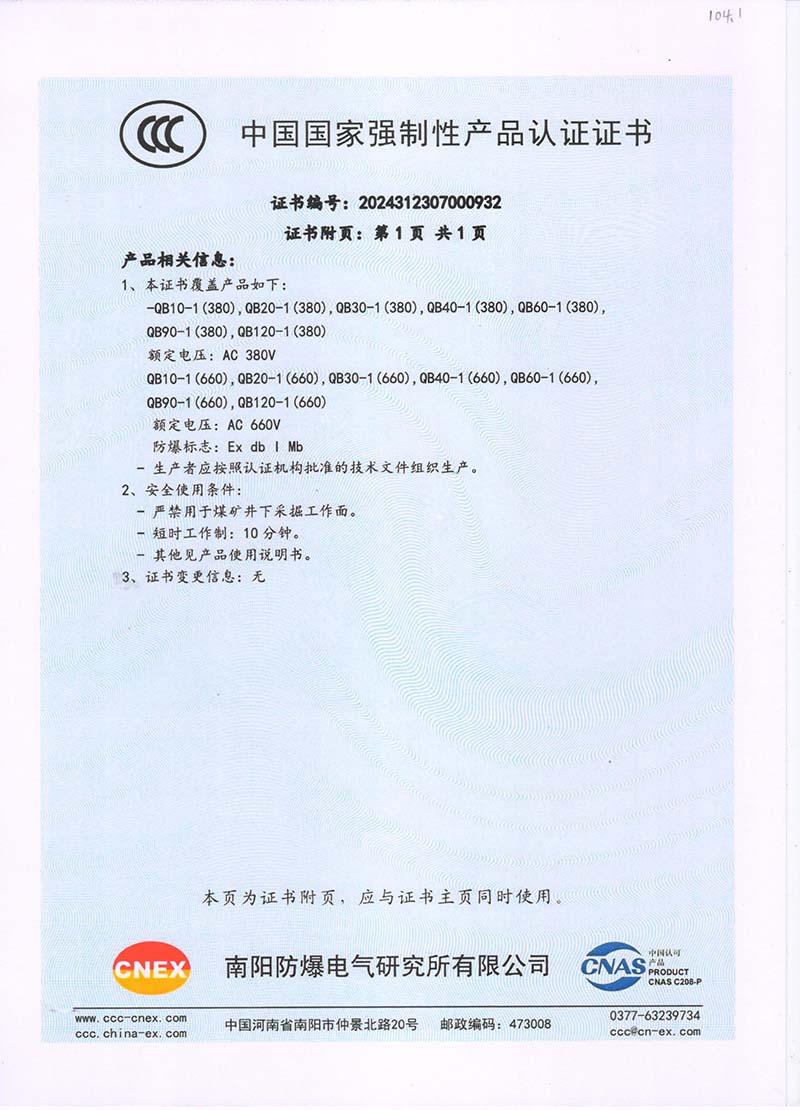 礦用隔爆QB(380V 660V) 國家強制性產(chǎn)品認證證書104.1
