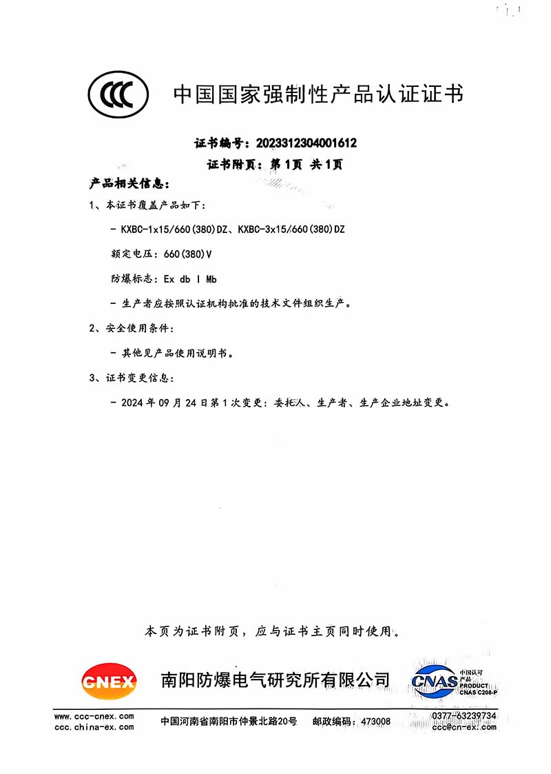 礦用產(chǎn)品安全標志證書KXBC-1 15 660(380)DZ